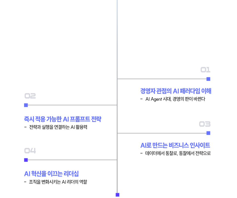 - AI 전환 시대, C-Level의 새로운 역할 재정의 - AI 조직 설계 및 변화관리 전략 - AI 도입 실행 로드맵과 조직문화 혁신 방향 제시 |