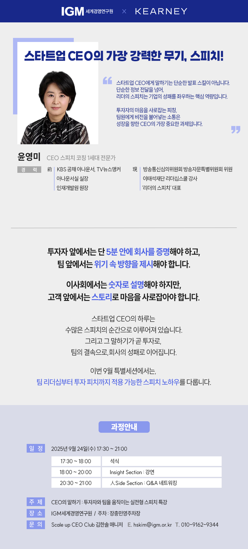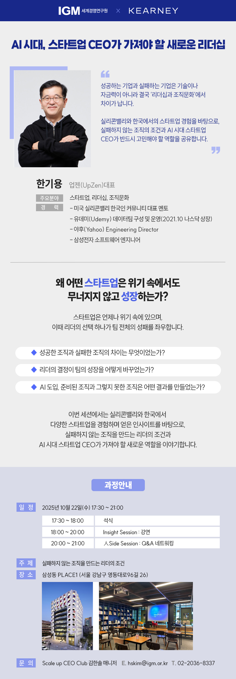 Scale-up CEO Club은 스타트업 CEO들이 경영 구루와 직접 만나 멘토링을 받을 수 있는 기회를 제공합니다.